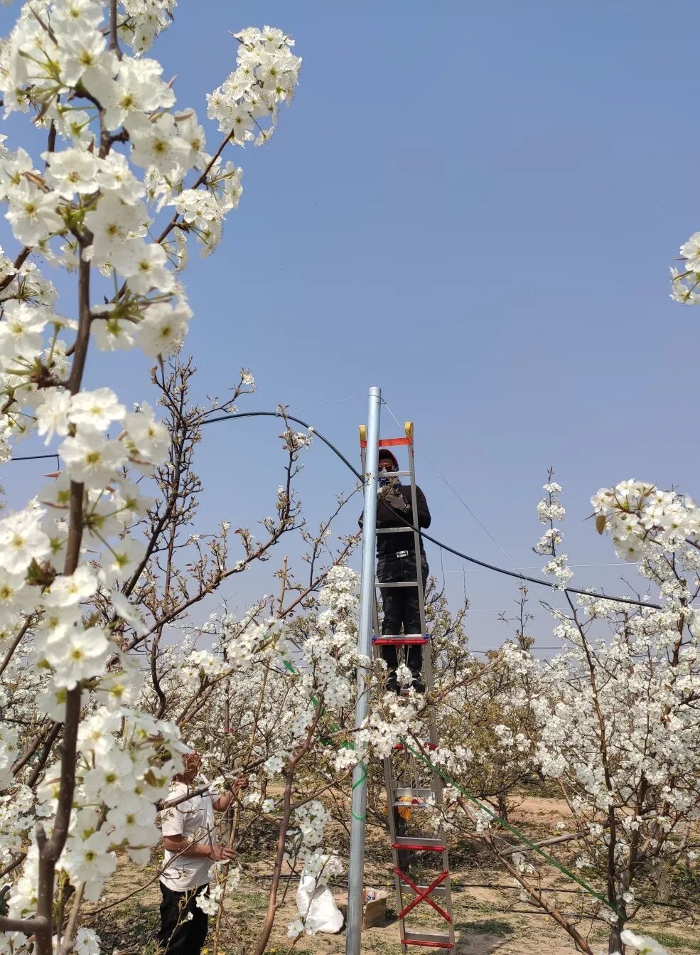 在梨树顶部布置倒挂旋转微喷