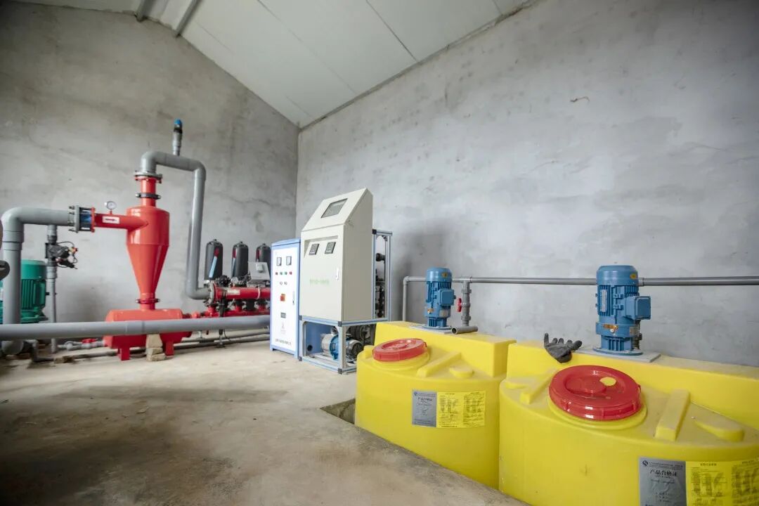泵房内置施肥机、过滤系统、阀门控制器、电磁阀、墒情数据采集终端,与田间管路形成整个水肥一体化自动控制系统。